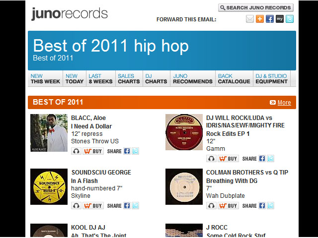 Soundsci – “In A Flash” (feat Oxygen)/ U-George – “Class In Session blessed to be voted one of the best releases for Hip Hop/R&B for 2011 with Juno Records. We came in at 6 in the Juno 2011 Hip Hop chart one place behind DJ Shadow & one place in front of the amazing SPOX 45! 2012 got to be a top 5 kinda year?